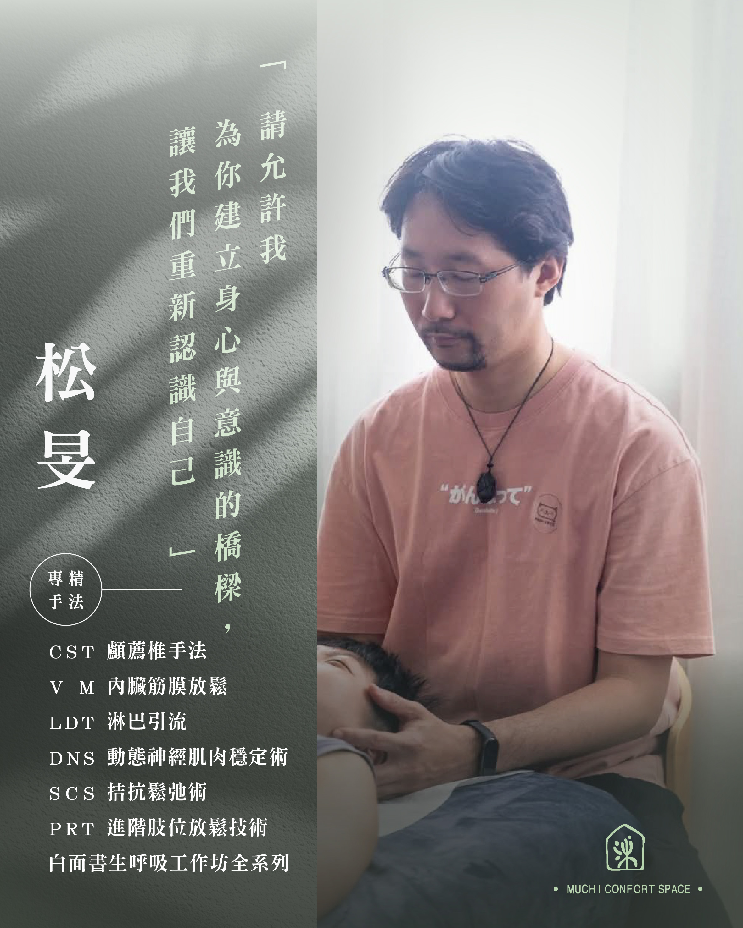 松旻|顱薦椎平衡與深層張力調整師松旻專注於顱薦椎系統與深層張力的細微梳理,以極輕柔的方式,引導身體回到自然平衡狀態。