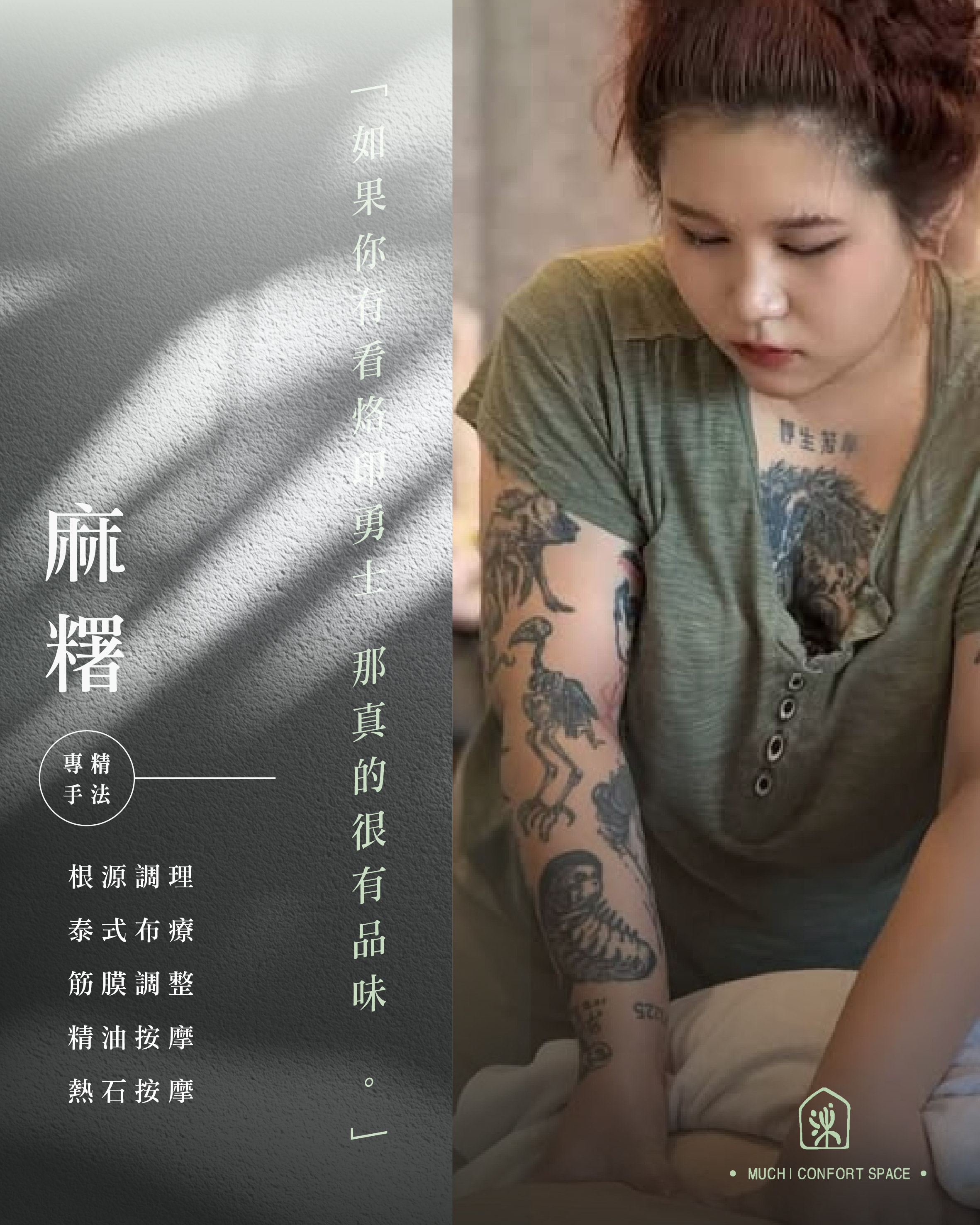 麻糬|沉浸式油推與植物芳療引導師麻糬擅長以連續、流動感強的油推手法,搭配植物精油,營造深度放鬆與沉浸體驗。